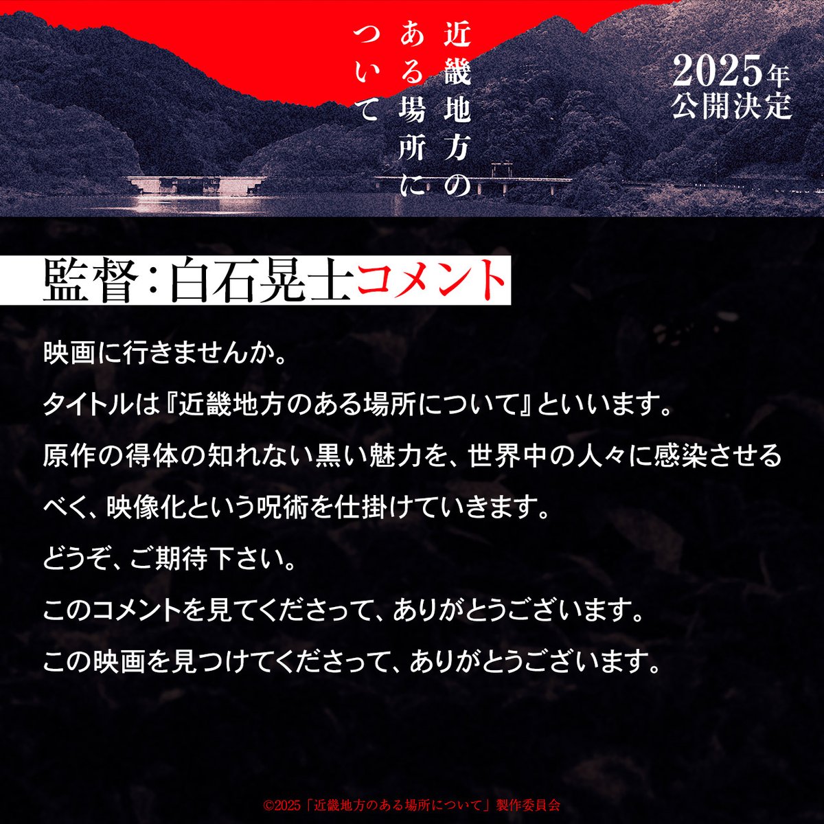 | 「行方不明の友人を探しています。」から始まる衝撃作を映画化!『近畿地方のある場所について』白石晃士が監督 …発行部数30万部突破、日本全国で話題沸騰中の小説「近畿地方のある場所について」の映画化が決定。2025年内の公開を予定している本作から、特報映像が公… (出典:) |