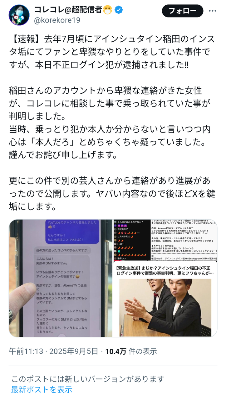 コレコレは6日、稲田のインスタグラムアカウントに不正ログインした犯人が逮捕されたことを受け、昨年7月下旬に稲田のアカウントの投稿を「疑惑」として取り上げたことを、Xを通じ謝罪。同日、YouTubeチャンネルでの生配信で、騒動の経緯を説明するとともに、「当時、『稲田さんがやってるんじゃね?』って内心、思っとった。実は稲田さんとLINEでつながっていて、LINEで謝罪した」と明かしていた。