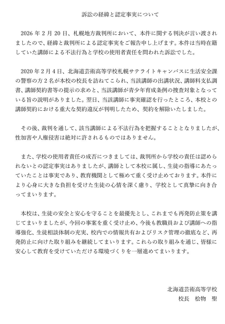 上記の札幌地裁の判決を受けて、同高校の公式サイトは声明文を発表。《学校の使用者責任の成否につきましては、裁判所から学校の責任は認められないとの認定事実はありましたが、講師として本校に属し、生徒の指導にあたっていたことは事実であり、教育機関として極めて重く受け止めております。本件により心身に大きな負担を受けた生徒の心情を深く慮り、学校として真摯に向き合ってまいります》と、再発防止に向けた取り組みを継続していくとした。